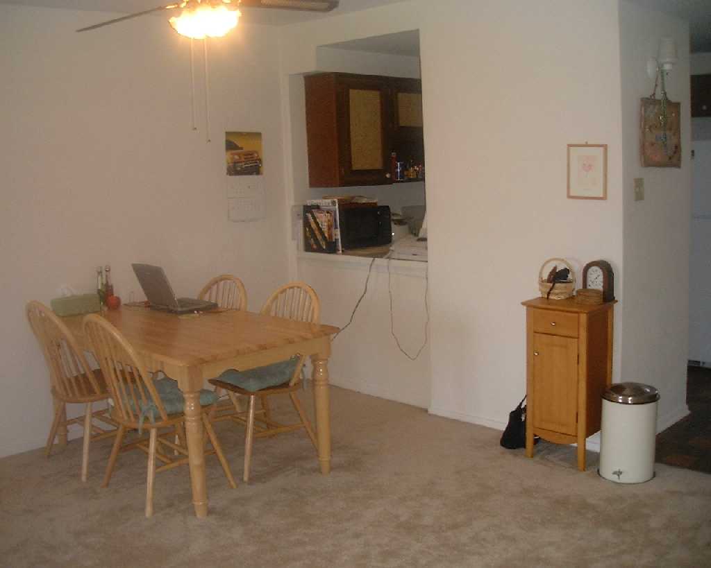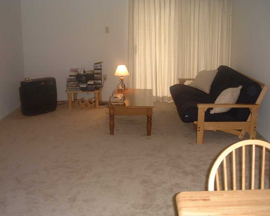 リビングルームその2 毎日、ここでごはんを食べてます テーブルの端っこに見えるノートパソのある席が eikoの指定席です 日中は、ほぼここから動きません(^-^) 右手に見えるのがキッチン、なんですが 玄関からつながっているので、キッチンは土足 リビングからが絨緞になります アメリカ人は、平気でここを土足で入ってきます すかさず「靴ぬいで!」と言います(^-^) |